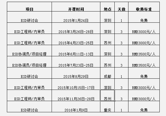 讓專業(yè)更專業(yè),為了進一步推動ESD防護技術的普及,迎合各類企業(yè)2015年ESD培訓需求,中明科技旗下子公司—深圳市博瑞思制定了相關的ESD公開課培訓年度計劃,敬請各位查閱,同時熱烈歡迎各位企業(yè)負責人踴躍報名!